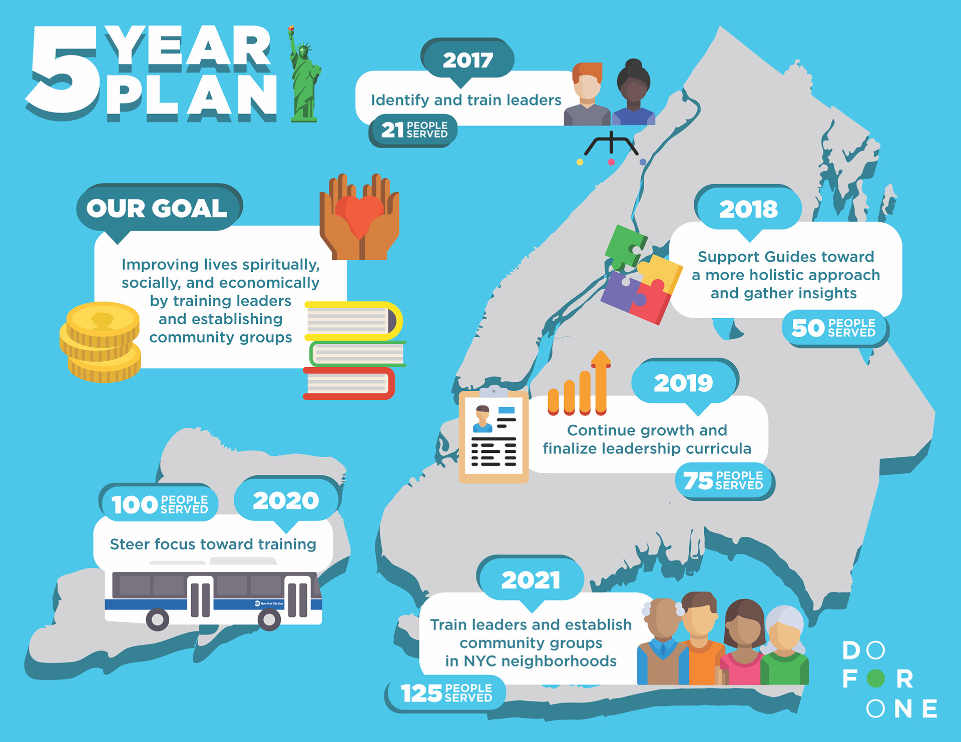 I was asked to help Do For One create two graphics highlighting their five year plan and overall organizational structure to send out in emails as well as to be distributed both in print and on their website. With a lot of icons and shapes to balance, I feel like we struck a good balance between style and substance.